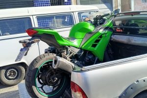 Imagens de monitoramento flagraram momento em que o dono da Kawasaki chegava em casa e foi abordado por dois indivíduos que também estavam em uma moto A GCM...