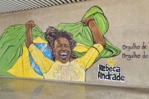 A maior medalhista olímpica brasileira, Rebeca Andrade, foi eternizada em uma grafite com imagem em uma parede da Estação Aeroporto-Guarulhos, da Linha 13-Jade...