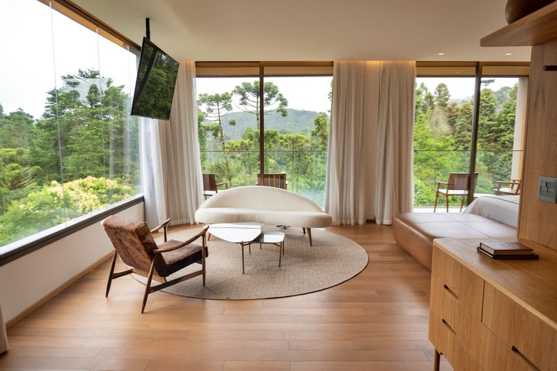 O prédio contemporâneo é a concretização dessa nova fase. As acomodações foram desenhadas para oferecer conforto tecnológico de maneira discreta, sem excessos visuais, preservando o minimalismo, a funcionalidade e a atmosfera de tranquilidade. Com materiais nobres como madeira e texturas naturais, o edifício traduz fisicamente o conceito da marca: acolhimento, silêncio e integração entre interior e exterior, entre o histórico e o moderno. A paleta de cores aplicada aos apartamentos dialoga diretamente com a paisagem da mata e reforça a atmosfera de refúgio.